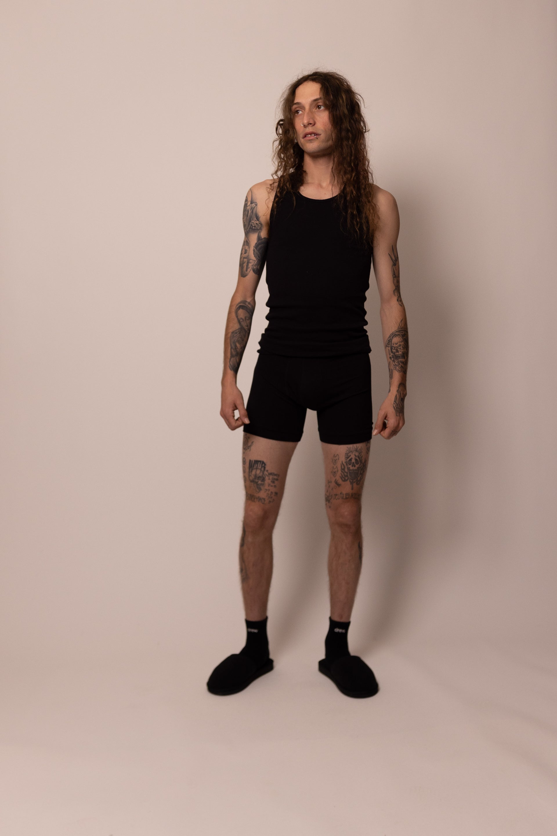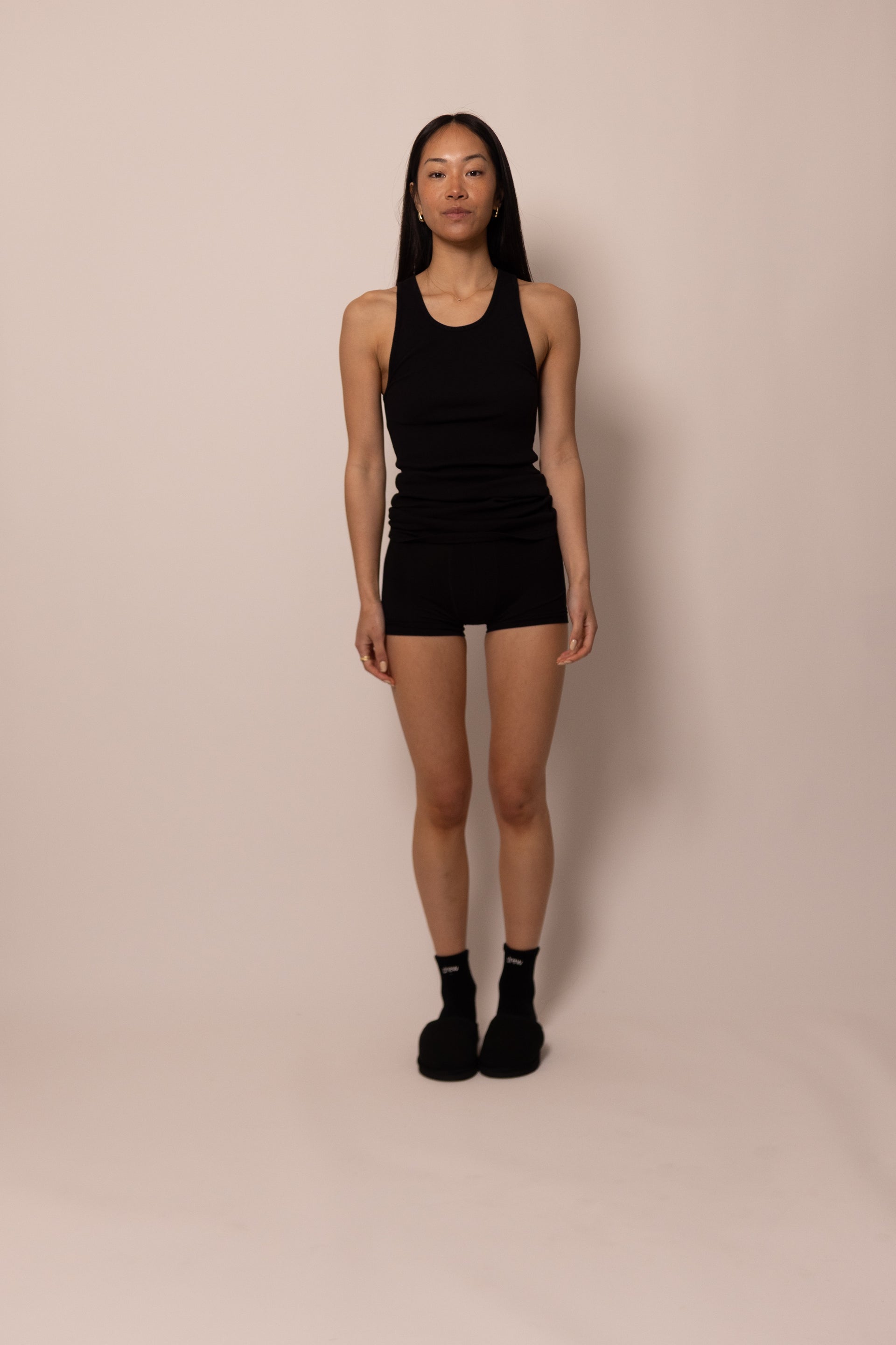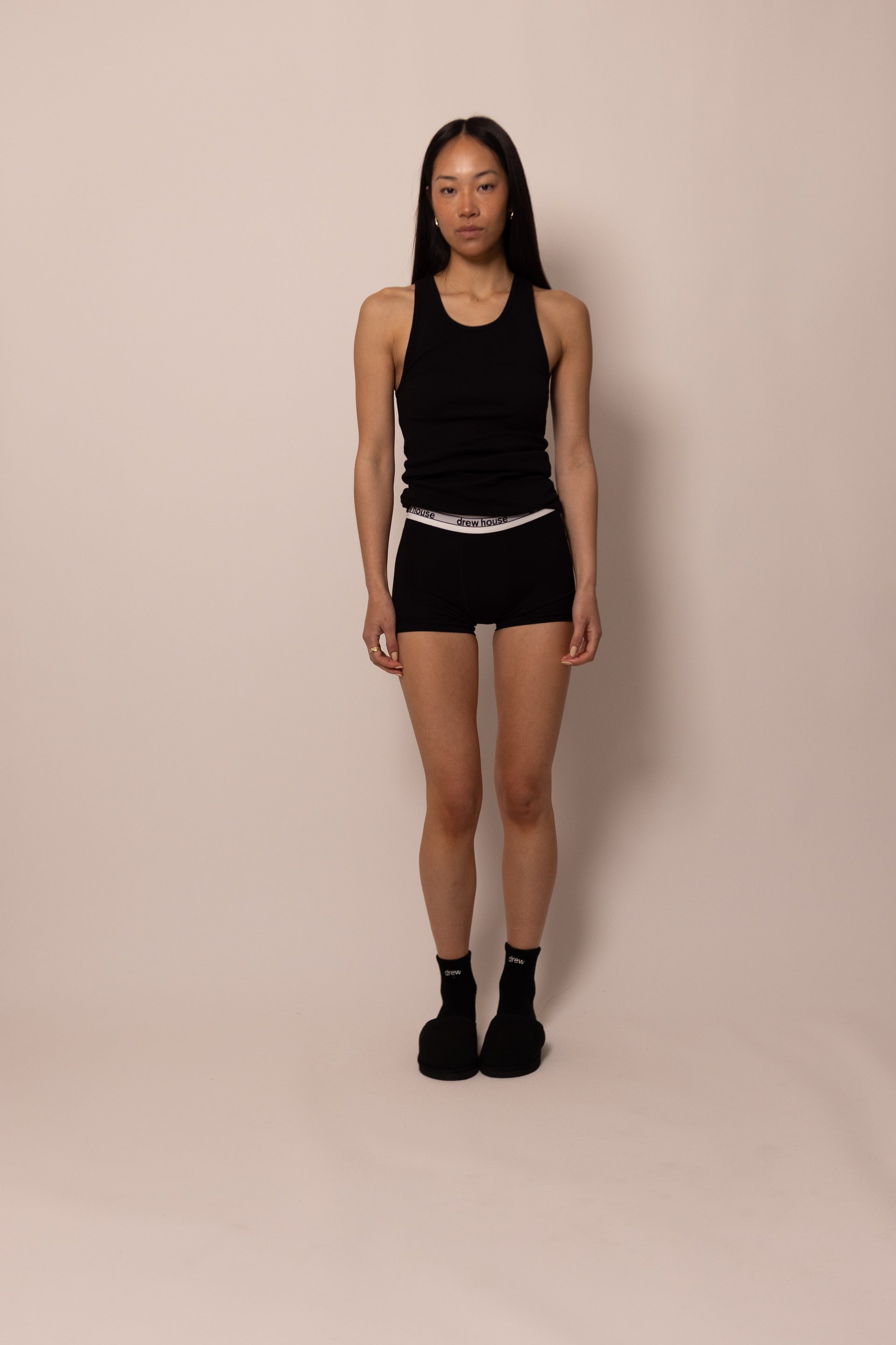 the foundation tank is our take on the classic and is meant to be worn however you want. layered under your favorite drew basics, the long fit can be customized to your style. we love to wear ours by itself straight leg jeans and house slippers :)